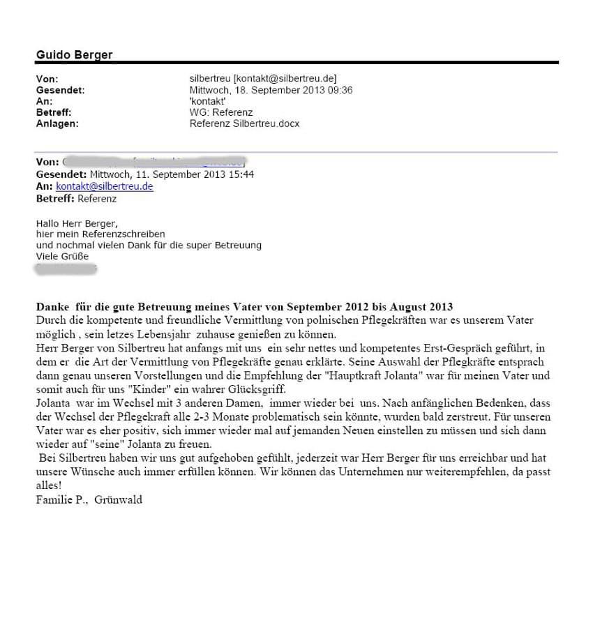 Durch die kompetente und freundliche Vermittlung von polnischen Pflegekräften war es unserem Vater möglich , sein letzes Lebensjahr zuhause genießen zu können. Herr Berger von Silbertreu hat anfangs mit uns ein sehr nettes und kompetentes Erst-Gespräch geführt, in dem er die Art der Vermittlung von Pflegekräfte genau erklärte. Seine Auswahl der Pflegkräfte entsprach dann genau unseren Vorstellungen und die Empfehlung der „Hauptkraft Jolanta“ war für meinen Vater und somit auch für uns „Kinder“ ein wahrer Glücksgriff.